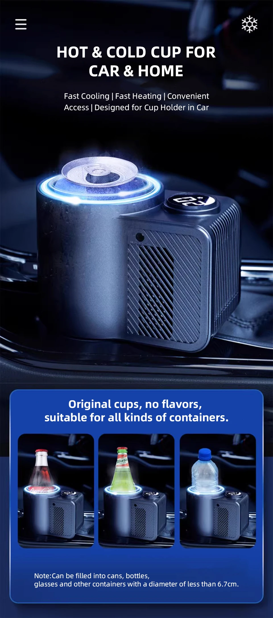 A 2-in-1 car mug that heats or cools beverages using advanced Peltier technology. Made with ABS and aviation aluminum, it holds up to 300ml and operates at 12V DC. Features an LED touch screen for real-time temperature monitoring, adjustable cup holder fit, and detachable cup for easy cleaning. Ideal for cars and home use, supporting drinks from 0°C to 60°C.